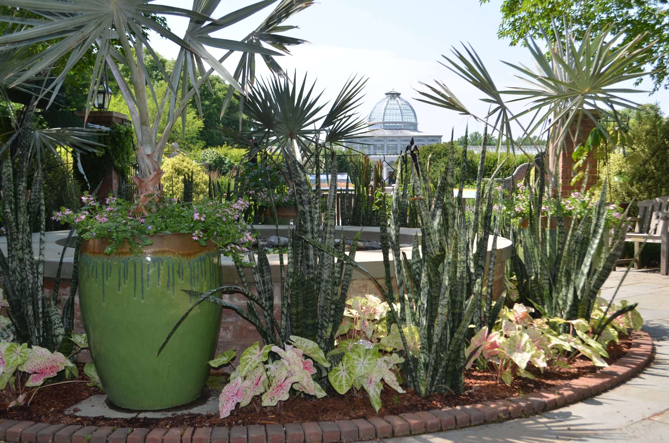 Snake plants, sometimes called “mother-law’s-tongue,” are fascinating plants that thrive easily both indoors and out. Also, they make quite an impression! This summer, Senior Horticulturist Dean Dietrich planted a cultivar of snake plant, (Dracaena trifasciata) ‘Black Coral,’ as an annual on the North Fountain Terrace outside the Robins Visitor Center. They add so much texture and height to this area and are striking against the background of the Conservatory in the distance. We have noticed more than a few of our visitors exclaim, “Wow!” as they enter the doors to the Garden. Outdoors, the plants are simply stunning, especially in combination with the Bismarckia nobilis palms and elephant ear, Caladium ‘Miss Muffet’.