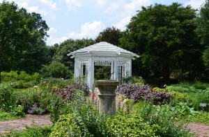 Gazebo at the end of one-of-four brick paths leading from the center of Grace Arents Garden, giving the garden symmetry, another element adding to its Victorian-style.