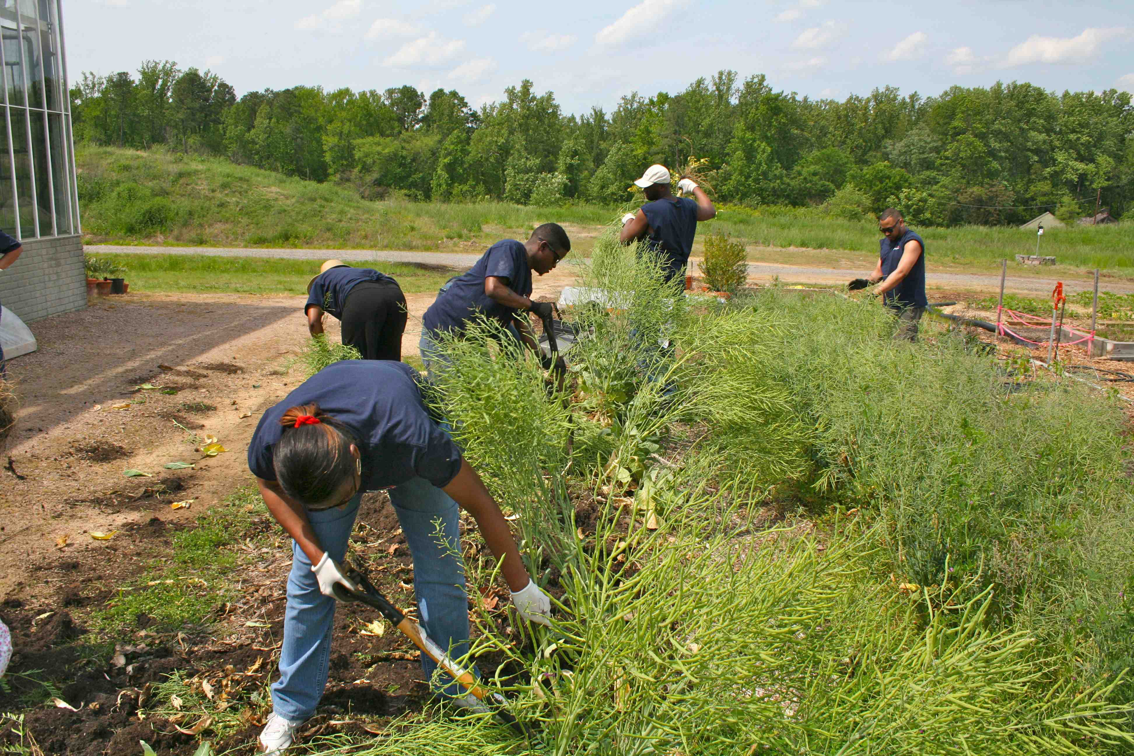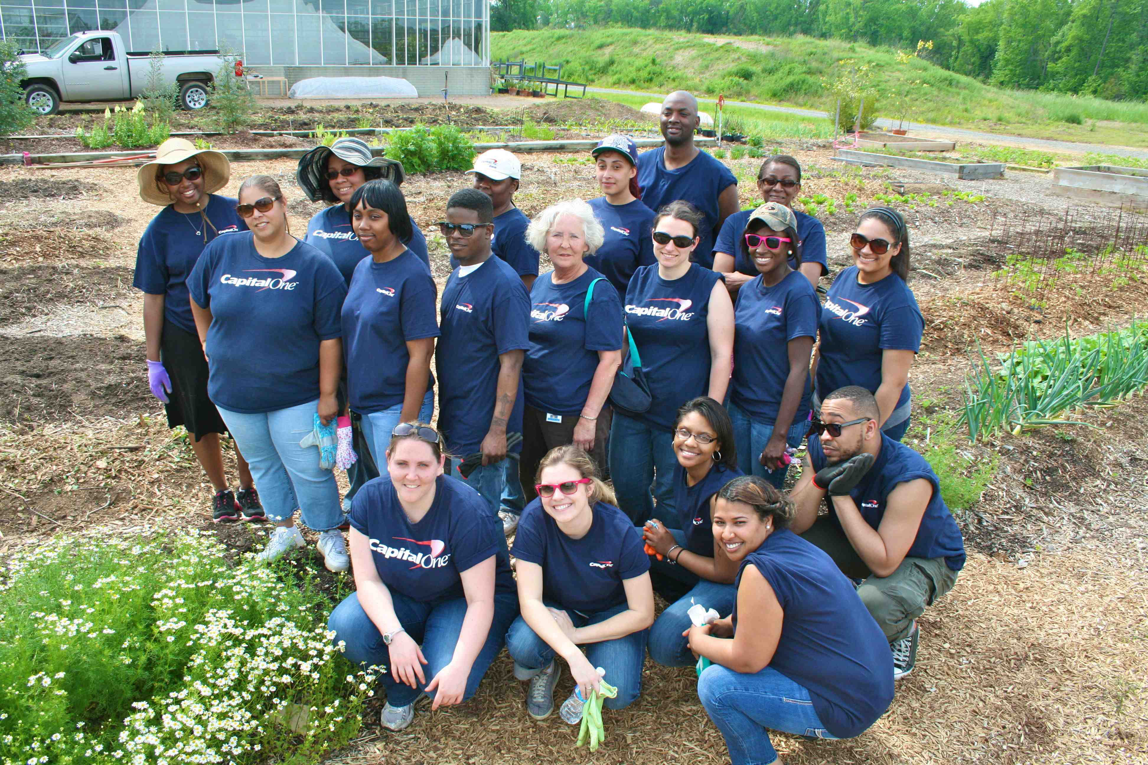 The Community Kitchen Garden enjoyed a productive visit from 20 volunteers from Capital One’s Merchant Disputes department. Led by Wilma Rooney, the team accomplished a great deal of labor for the Garden, despite the surprisingly sweltering heat for early May. During the past two Saturday morning work sessions we engaged a combined total of 25 individual volunteers registered through HandsOn RVA, in addition to several Lewis Ginter volunteers each day. We also had eight Kroger employees who worked in the garden. The first tomato and eggplant seedlings have been planted, zucchini seed has sprouted, and beets, turnips and red potatoes are coming along nicely.