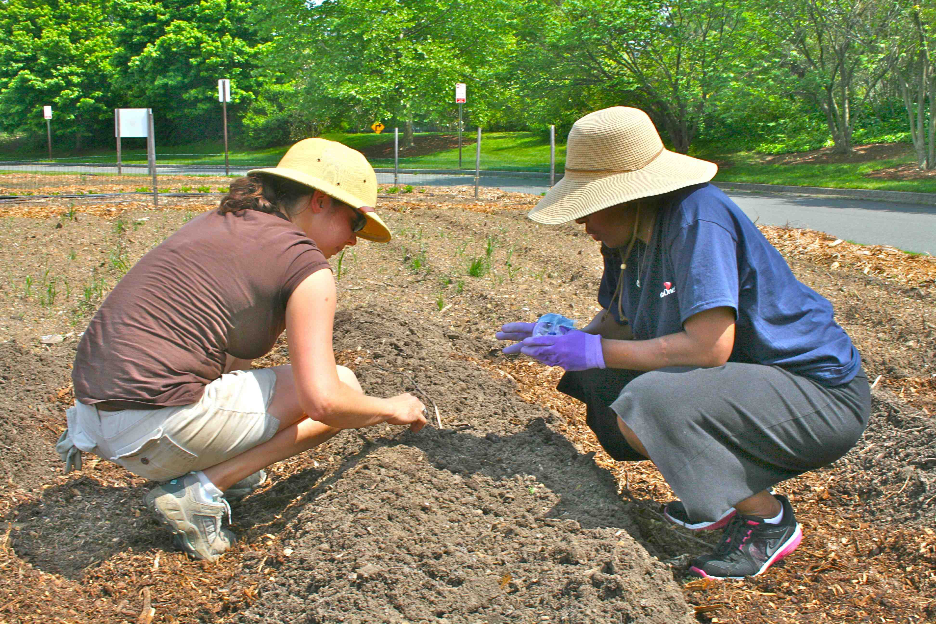 Lewis Ginter gardener Laura Schumm plants Gold Rush zucchini seed with a member of the Capital One team. They demonstrate style and wisdom in their choice of gardening hats.