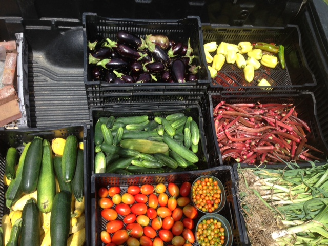 A colorful harvest loaded up and ready for delivery: zucchini, cucumbers, eggplant, peppers, okra, tomatoes, and onions.