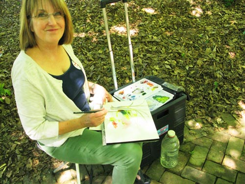 Not quite as dramatic as stated above, but that’s almost what Patti Bartol told me as I approached her as she sat quietly painting a lovely watercolor in the dappled shade of Flagler Garden. Her mind was at ease as her brush rhythmically dipped in water, then paint, and finally washed onto paper with stunning results. She was capturing the serenity of the dogwoods against azaleas with mottled light.