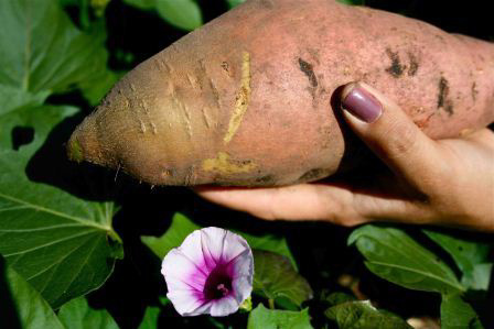 As we’ve mentioned on this blog, in July volunteers planted 250 sweet potato slips in the Lewis Ginter Community Kitchen Garden. The slips were donated by Clifton Slade from his organic farm in Surry, Va. Sweet potatoes are delicious and packed with Vitamin C, calcium, potassium, and beta-carotene. These orange tubers, which are not related at all to white Irish potatoes, are so nutritious that they are considered a super food. And FeedMore also likes that they store well and have a long shelf life, so if needed they can store them for when they are needed.
