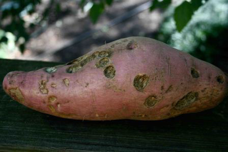 To our great relief, the damage to our sweet potato was only cosmetic. To complete our inspection Brian took the tuber home, peeled it, and had it for dinner. He reported back that the potato was very tasty and had great texture. Since our sweet potatoes will be donated and most likely peeled once they make it to the Community Kitchen, the damage to the outside won’t really matter too much. This cosmetic damage could be devastating though if we were growing these potatoes to sell at market. Farmers in the south have lost fields of sweet potatoes to white grubs because the damage they cause renders the tubers unmarketable, even though the damage is only skin deep.