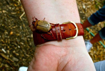 After some research, we determined our pest was the white grub. White grubs are the larval stage of scarab beetles, and many different types of scarab beetles were spotted in the Community Kitchen Garden this season including the June beetle, bess beetle, and grapevine beetle. The adult beetles lay their eggs in grassy areas, composts piles, mulch piles, etc. In fact, we inadvertently encourage the presence of some of these beetles by our extensive use of wood chip mulch. Once the grubs hatch they feed on organic matter like compost, decaying wood or roots and tubers of plants. These not-so-little grubs are known to cause major damage to turf grass.