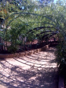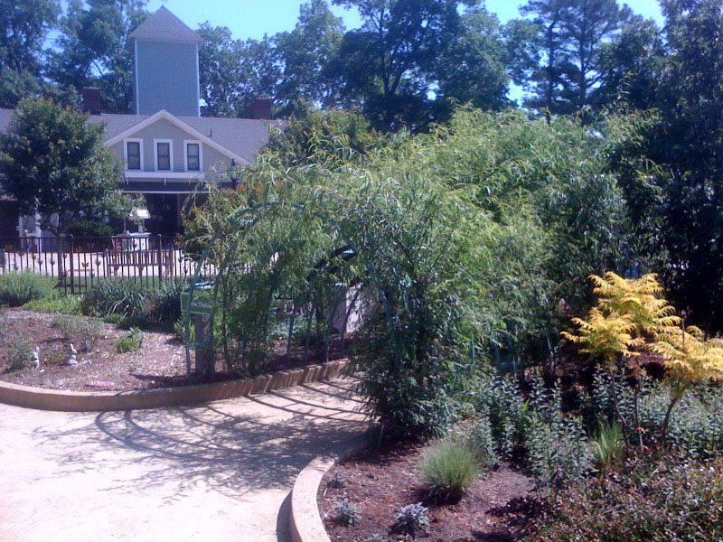 As the social media point person for the Garden, I’m always seeking out connecting with others in the Gardening world who have a similar mission to Lewis Ginter. This week, I hit pay dirt, when I discovered that the Children & Nature Network has a Ning community, made up entirely of educators who have a mission to integrate nature into their teaching. After only just a few minutes on the site, I felt like I’d found a new home. In particular, an article on creating live willow tree structures for children to play in caught my eye. Although I’d never heard of it, I knew immediately what a hit it would be with my own kids. Come to find, we’ve got one right here in the Children’s Garden at Lewis Ginter in the Bird and Butterfly Meadow! After several years of careful pruning, we’ve got a nice looking tunnel, and at the end a fort! It’s too short for adults — so it’s the perfect kid hang out!