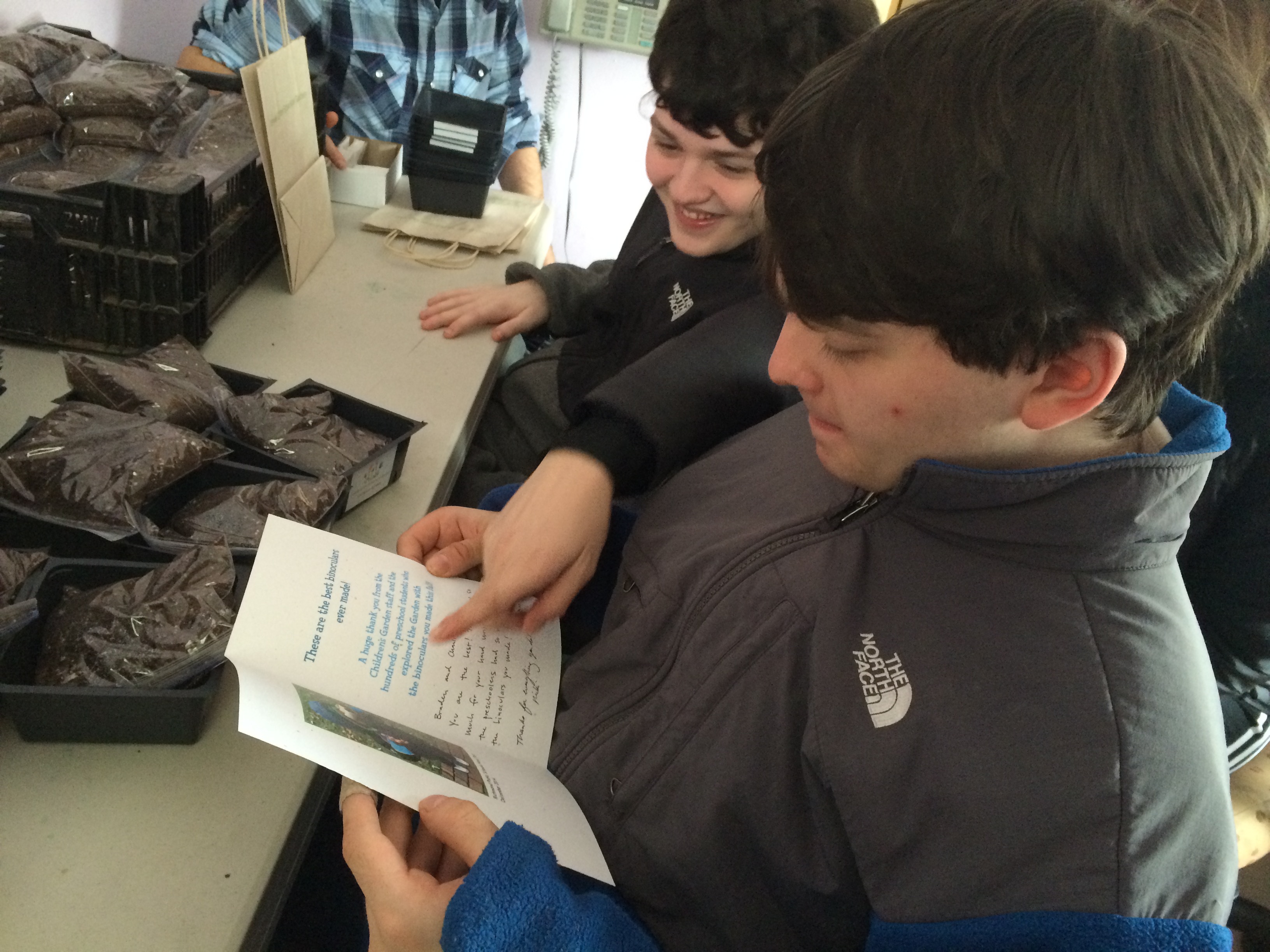 Last week I had the pleasure of meeting brothers Braden and Charlie Dolbec, young adults who come to the Garden as part of the Garden’s Vocational Program to gain workforce development skills and job training. Braden and Charlie work in the Children’s Garden each week, along with their support staff, behavior coaches Jimmy and Crystal, and the Garden’s Youth Programs Developer Nicki. When I arrived they were assembling soil, planting trays and seeds into planting packets for school groups to take back to their classrooms to start their own gardens after visiting our Children’s Garden on a field trip. They have also worked on other projects like assembling “binoculars” for the Garden’s Young Buds programming. These are very special binoculars made out of yarn, toilet paper rolls, and double-sided tape. Pre-schoolers who visit the Garden can narrow their focus to search for birds, plants and blooms, and while they are observing the gardens around them also collect leaves, seedpods and other treasures to decorate their binoculars. This day the Dolbecs were receiving a very special thank you note from the Garden’s Early Childhood Program Developer Kristin Mullen. Turns our Braden and Charlie assembled quite a few binoculars — over 600 to be exact. And the 3- and 4-year-olds from Richmond Public School Head Start really, really loved them. Here at the Garden, we are grateful for partners like Braden and Charlie who learn from us and give back too. We wanted them to know how much we appreciate their work and a thank you note with photos of the kids enjoying the binoculars seemed like just the right thing. Based on the smiles I saw, I think they enjoy it too.