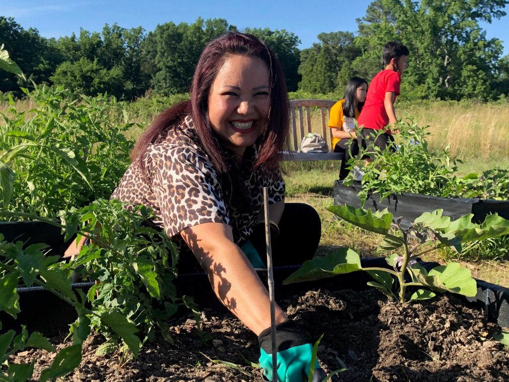 As Hameeda embraces the sunshine, we are standing in the Kroger Community Kitchen Garden at Lewis Ginter. Several other women and their children are nearby–planting, weeding and watering in seven raised beds.