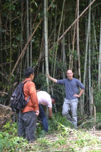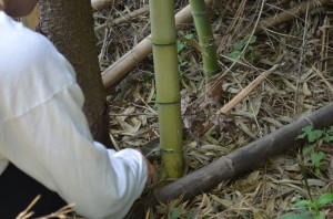 Dressed in long pants and armed with bug spray, the class traveled to the Garden on September 3 to harvest the bamboo. McGraw started with a brief lesson, explaining the characteristics of bamboo and how some cultures use it to create musical instruments. Kneeling, he struck the ends of bamboo sticks on the hard ground so students could hear differences in pitch. McGraw also explained how Indonesian rice farmers use an elaborate system of bamboo “tubing” in their fields to help distinguish variations in water flow by sound alone. The farmers can listen and tell if there are obstructions or if another farmer is diverting the water supply.