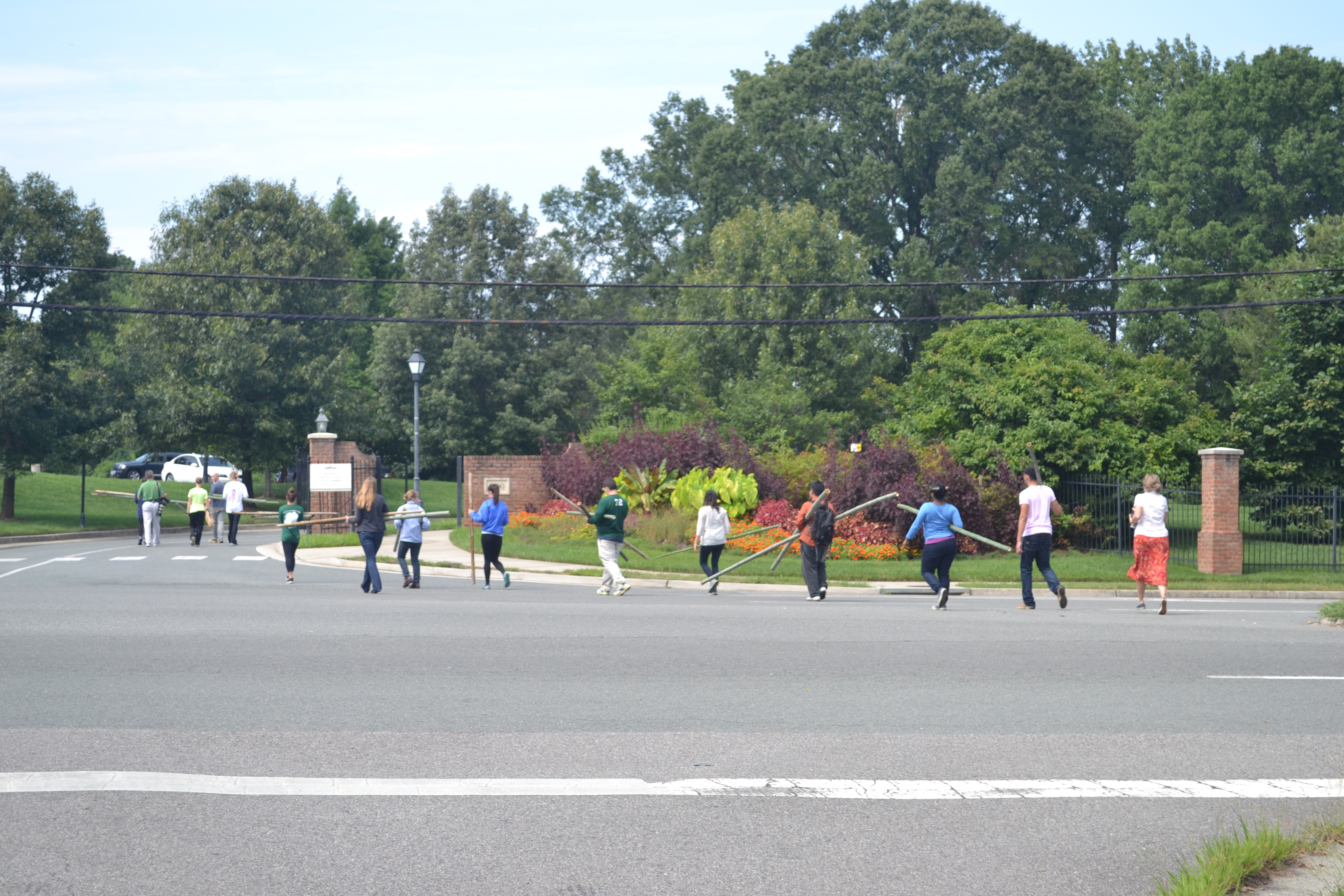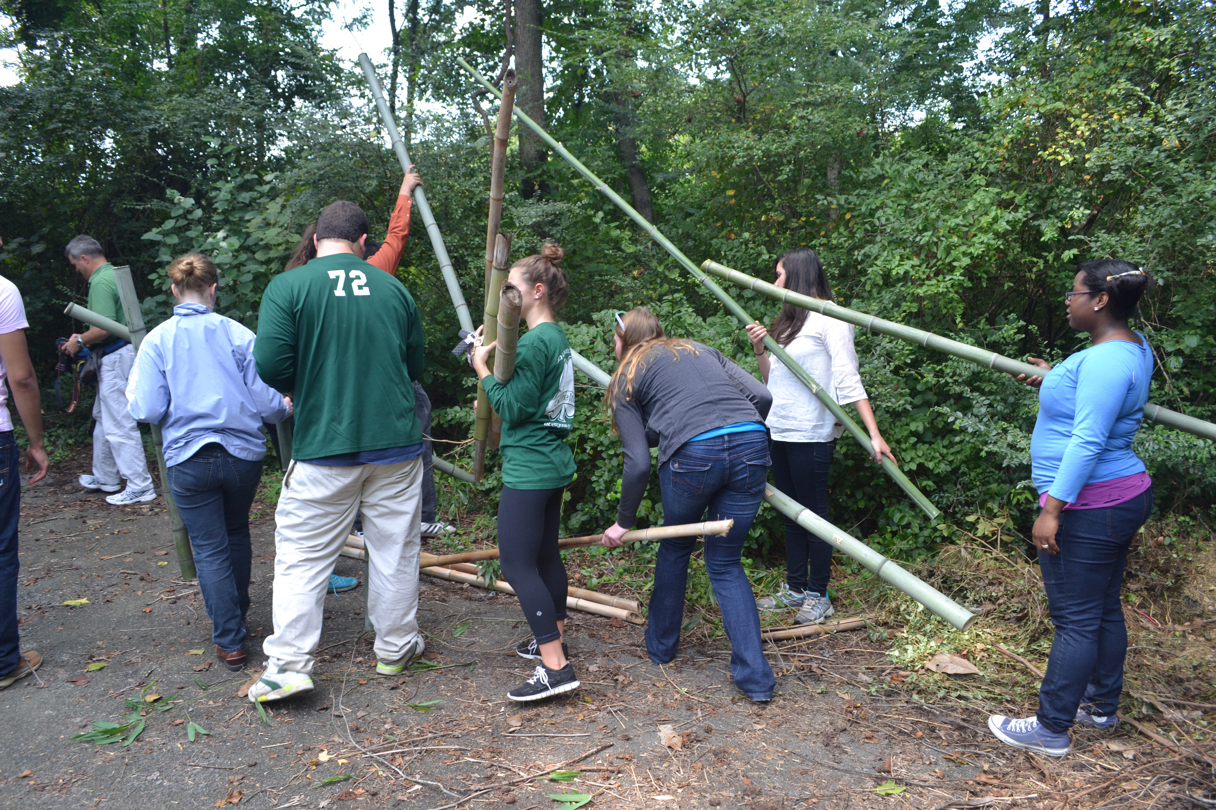 After a quick lesson in poison ivy identification provided by Gardener Leah Purdy, the intrepid students waded into the bamboo jungle. Tentative at first, they quickly identified the sizes they needed and began sawing and dragging the slender branches out of the dense growth.