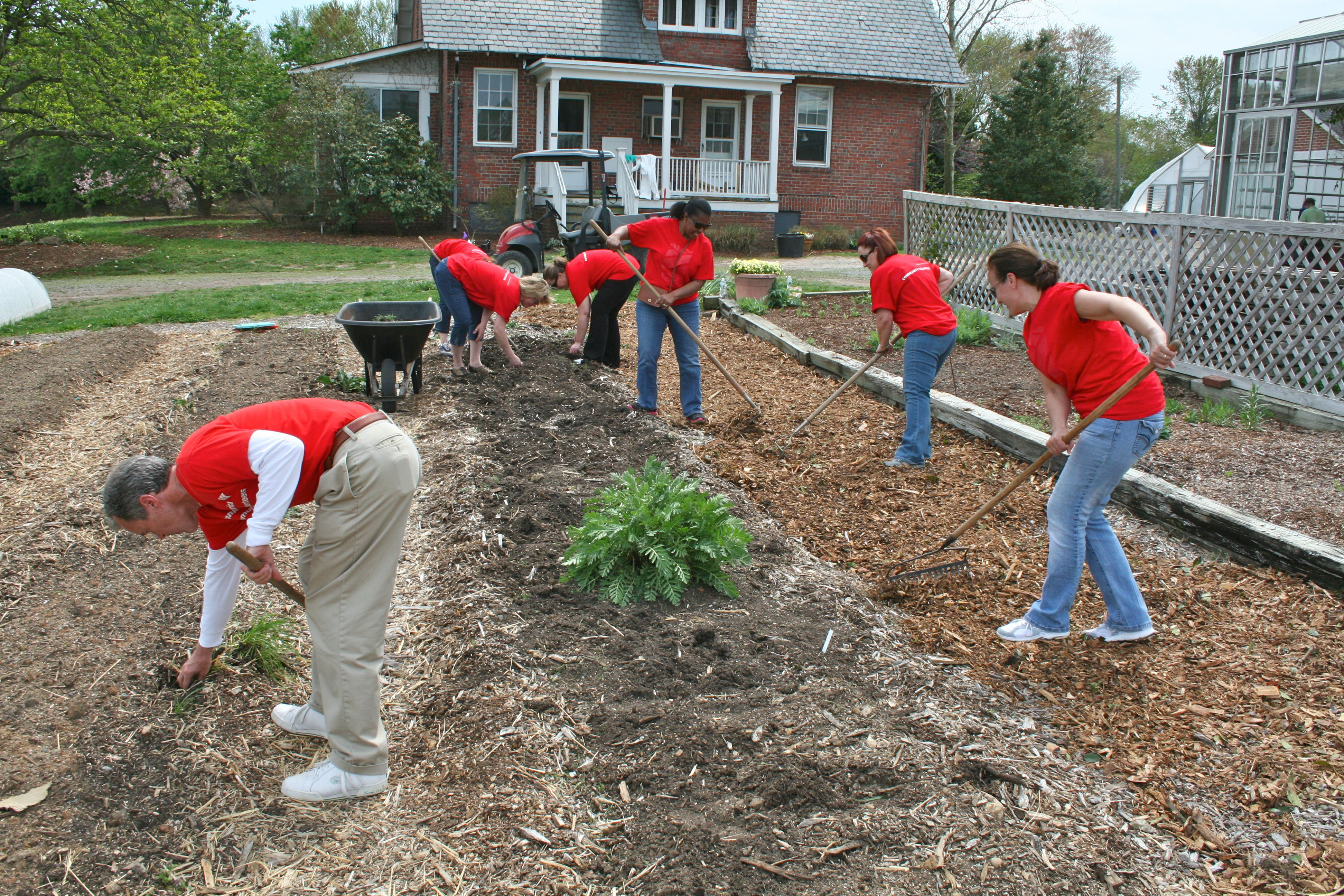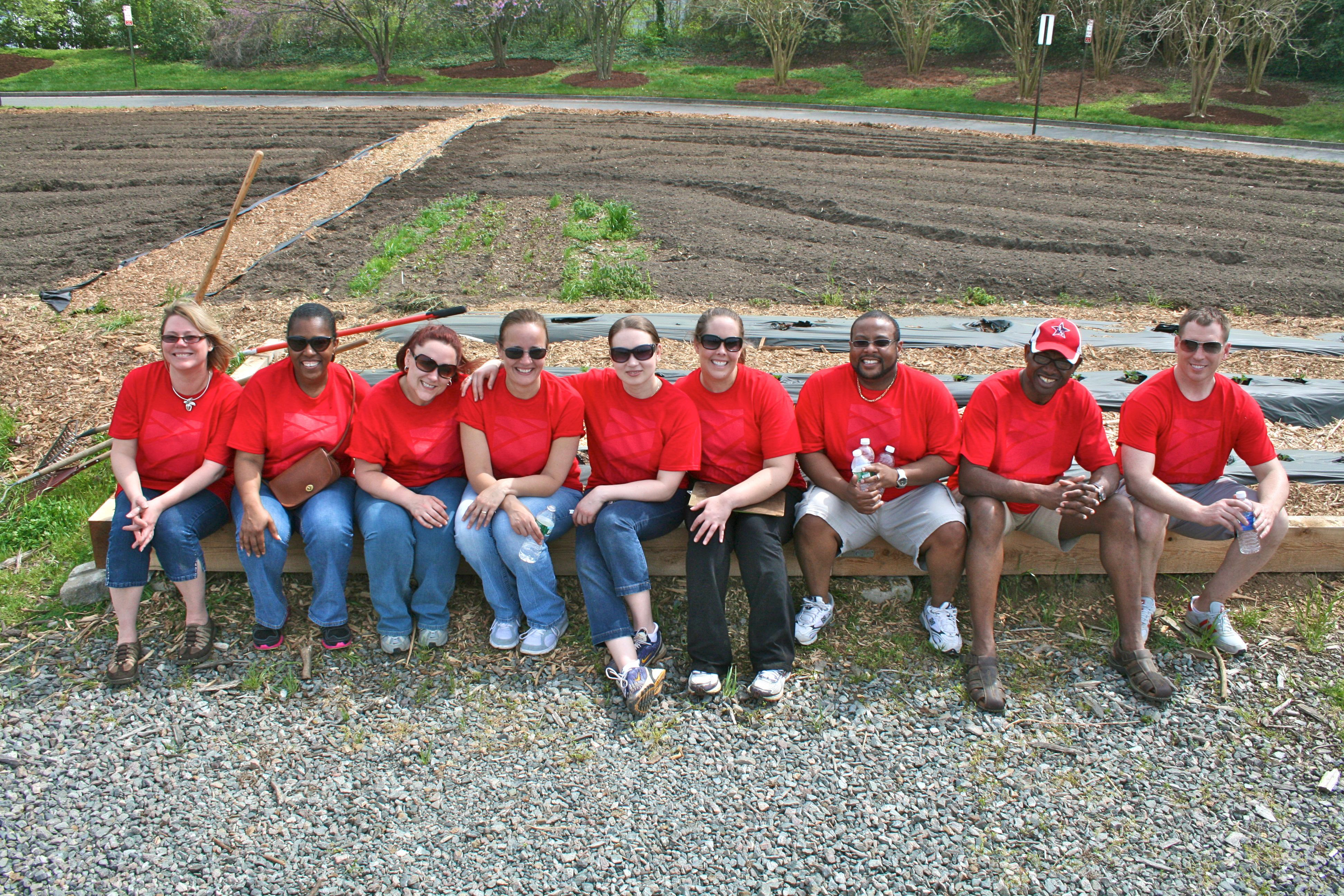Barrett Taylor, Banking Center Manager, from Bank of America lead a group of BOA volunteers working in the Community Kitchen Garden. Far-right is Barrett’s husband, Patrick O’Hagan, who is a Gardener at Lewis Ginter Botanical Garden.
