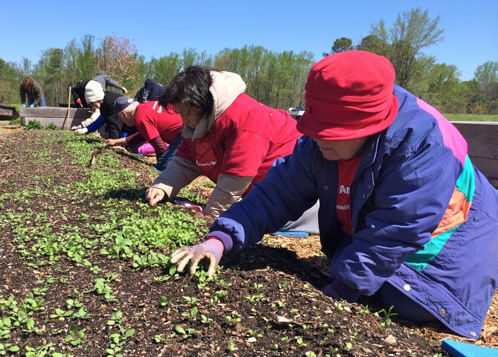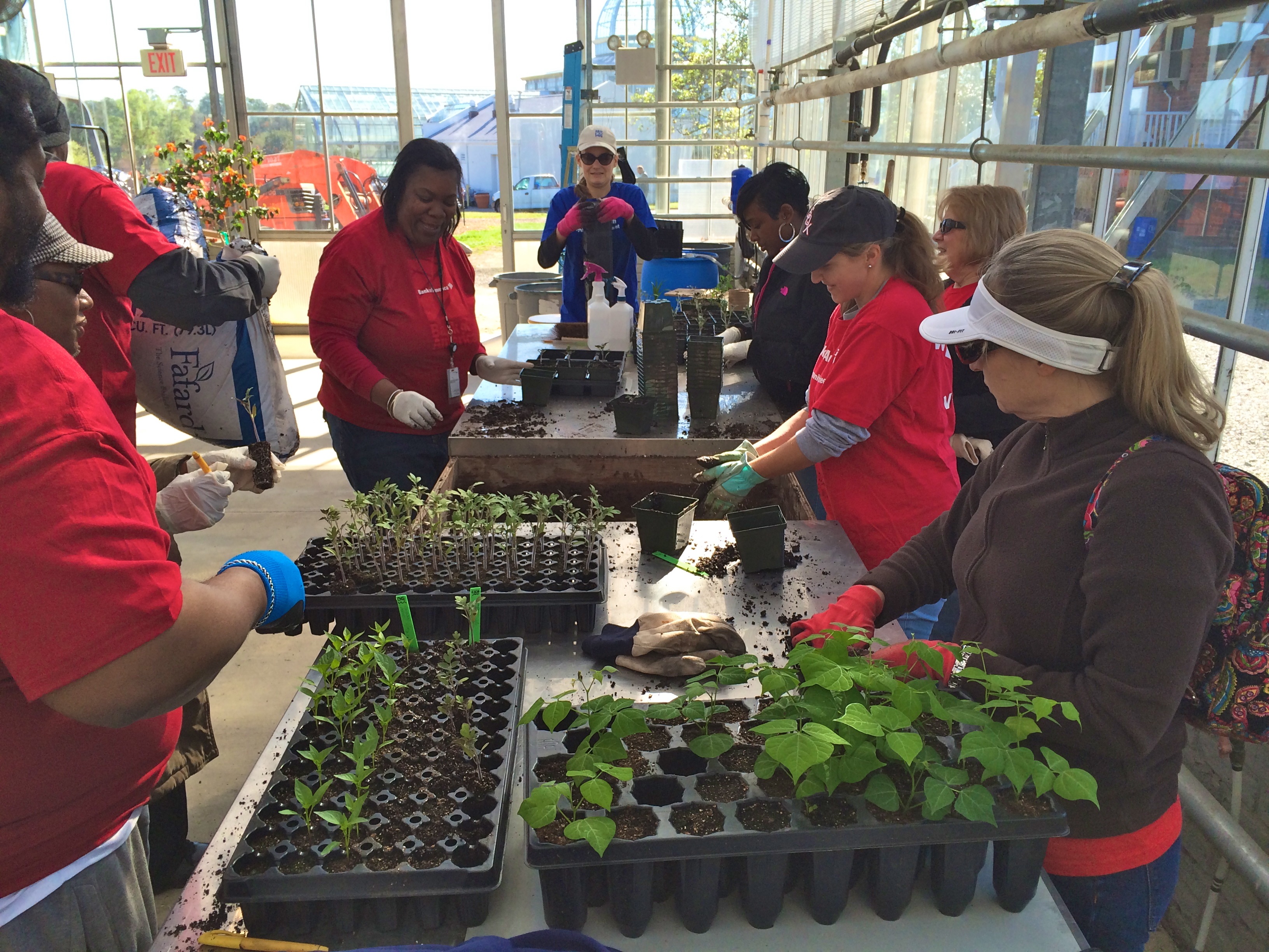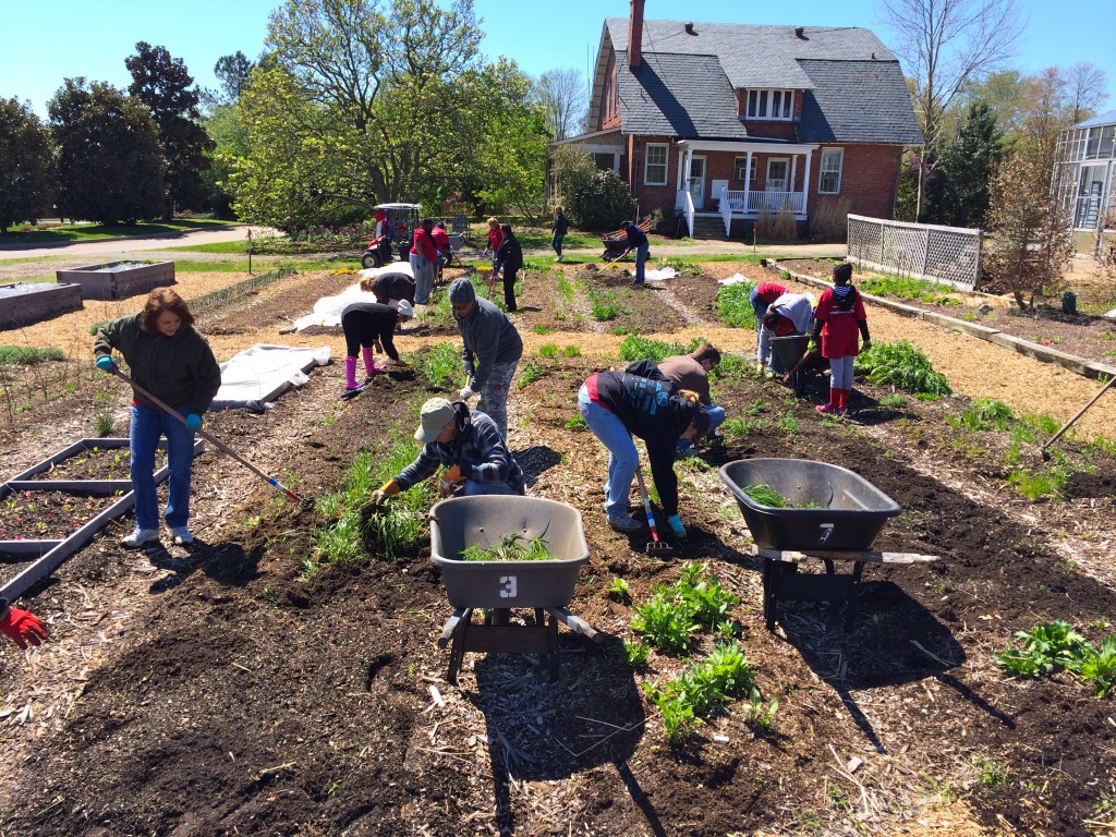 Thirty (30!) Bank of America volunteers worked in the Community Kitchen Garden on April 16. For the second year in a row the group was organized by Barrett Taylor, General Manager of the Short Pump Banking Center. (Barrett is the lovely wife of Lewis Ginter Botanical Garden’s Patrick O’Hagan, gardener.) The group of volunteers braved a very chilly start to the morning, with the wind chill temperature at freezing (or below), but warmed up quickly with a series of heavy tasks, including weeding planting beds, laying cardboard and mulching pathways. The group also thinned turnip seedlings, and a lucky few potted up tomato transplants in the comfy Massey Greenhouse.
