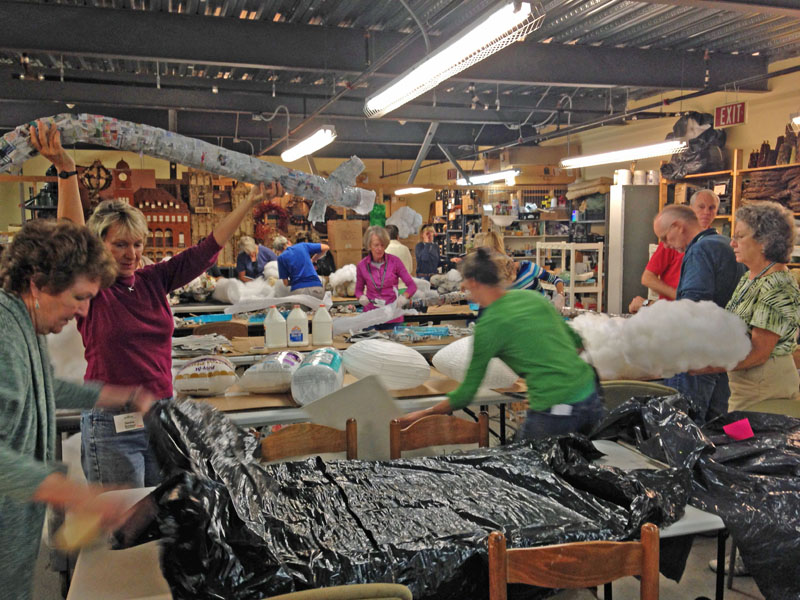 Volunteers working on octopus tentacles and making clouds for Dominion GardenFest of Lights: H2Whoa!