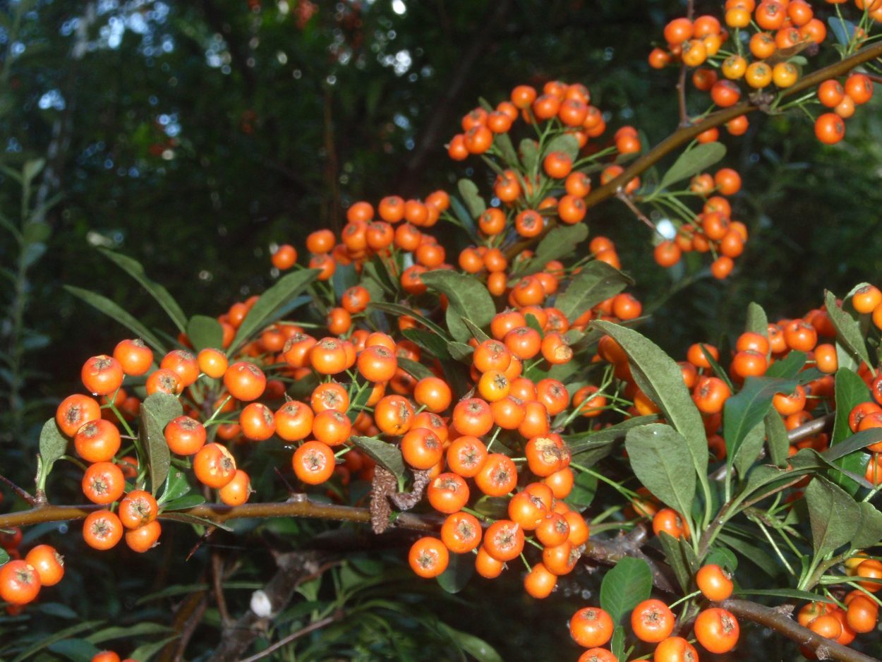 Pyracantha (Pyracantha): Firethorn, as it’s commonly called, grows heavy clusters of orangey-red to yellow berries. While birds seek its food and shelter, humans try to avoid its unmerciful thorns.