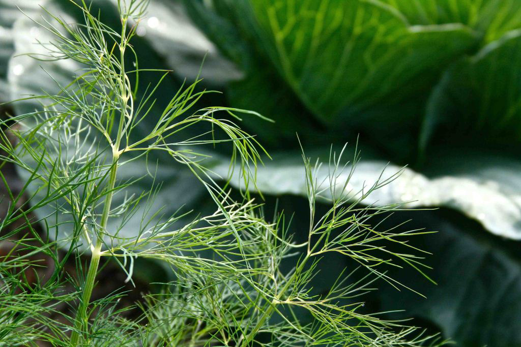 Aromatic herbs such as rosemary, dill, and thyme work well as companion plants. Dill is said to improve the growth of cabbage and be a good companion to lettuce also. This herb can cross pollinate with carrots, so keep those two separated.