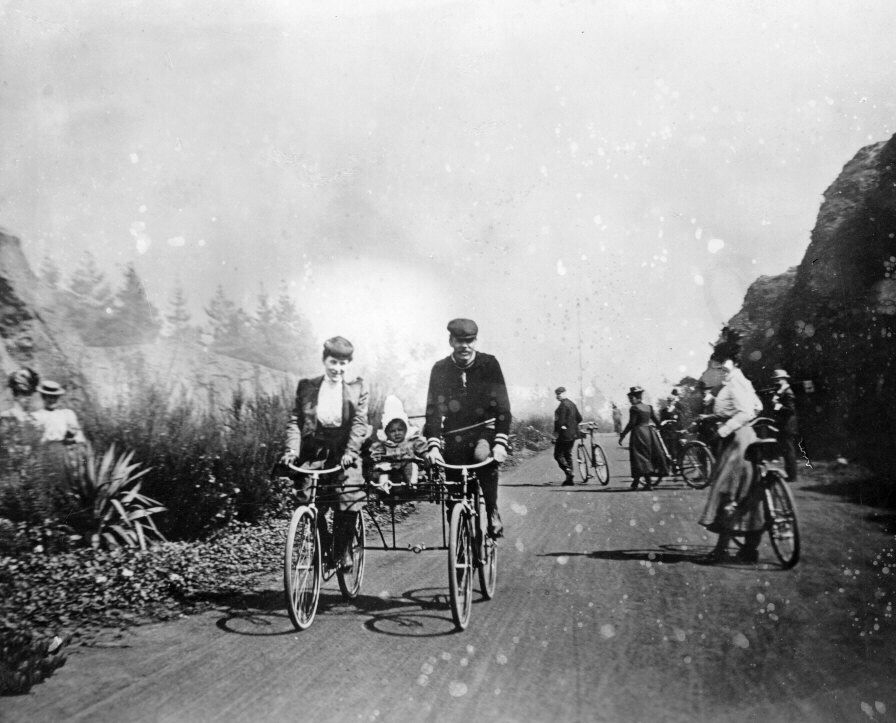 Tom Houff, author of On Richmond’s Wheel about cycling in Richmond, shared this photo with us “notice how an infant rides between two bicycles that are connected. That was the Golden Gate Park in California. I like it because it shows people out enjoying bicycle rides. The two bikes joined is technically a quadricycle, which evolved (thank you bicycle mechanic, Henry Ford) into the automobile.” Neat Stuff!
