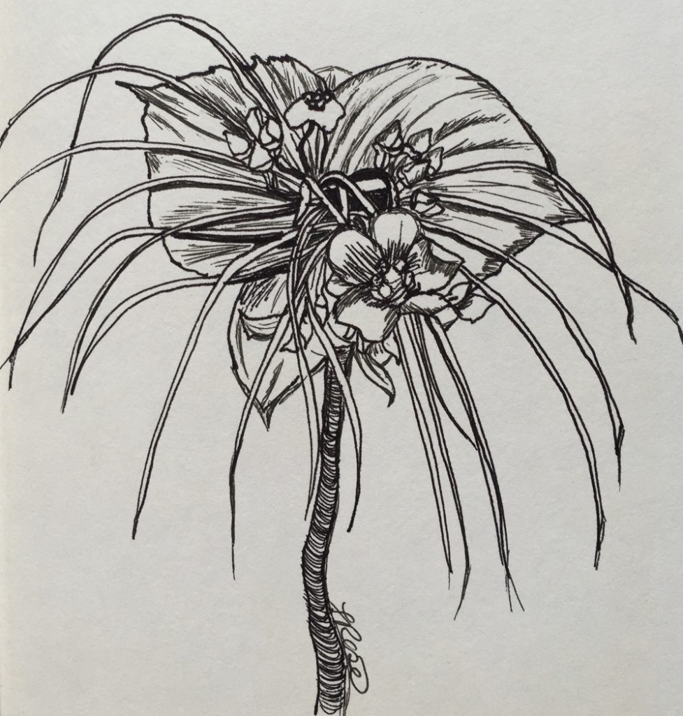 This beauty is continuing to turn heads! With over 100 shares on Facebook, the black bat flower is inspiring comments like: “I also shared the photo with a friend yesterday. We both learned about a flower we never heard of before! Thank you 😊” My favorite of all is this pen and ink drawing from Tracy Rose, an art teacher for the Buffalo Public Schools in Buffalo, NY. She was tagged on the photo by a friend and quickly inspired to draw this sketch while sitting in a conference.