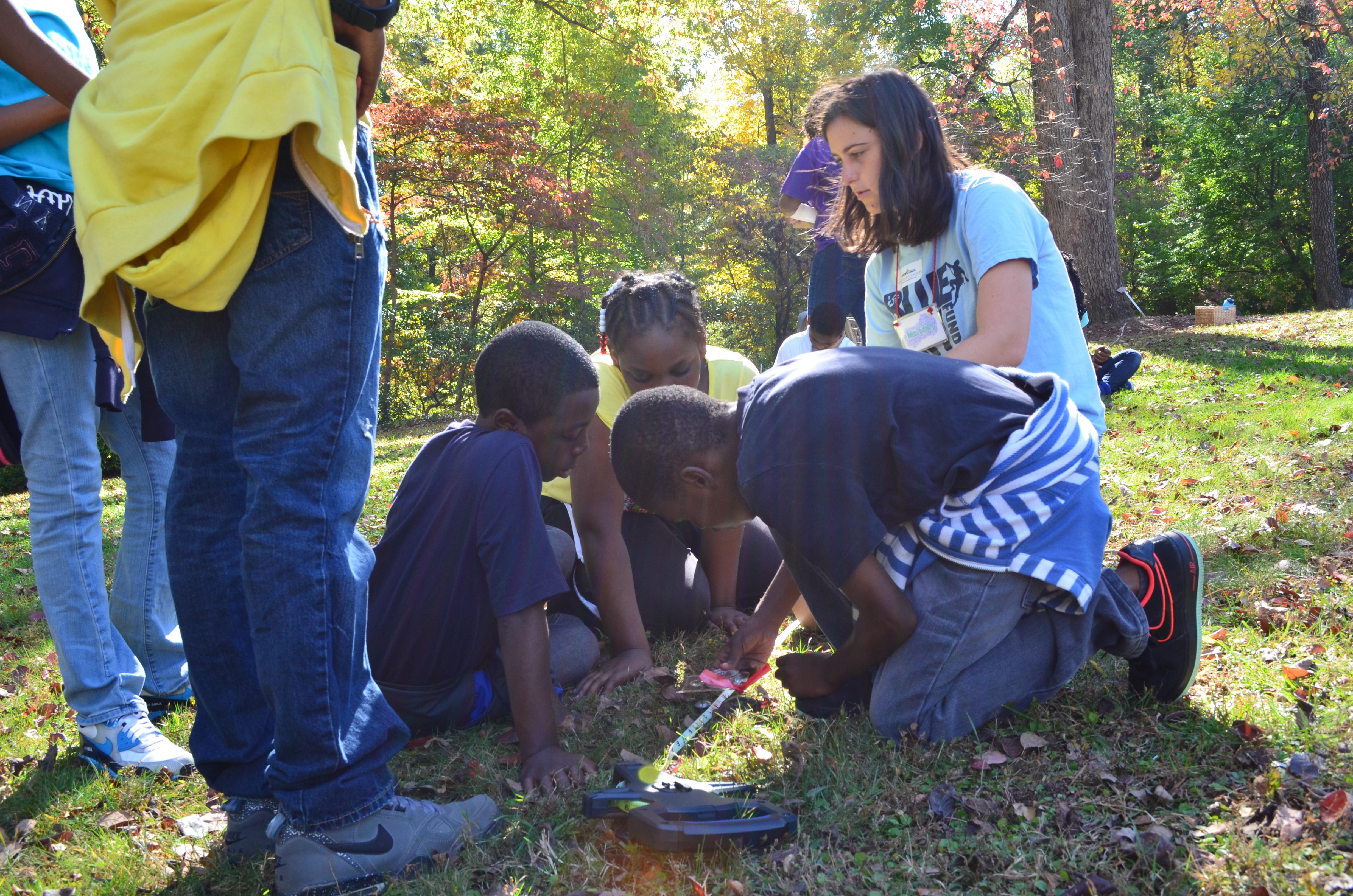 The kids worked in teams to measure the soil temperature at various intervals under and outside of the tree canopy. Here the students are learning scientific method, one of the 5th grade SOLs. Students used the scientific method to determine the effect of trees on soil temperature. Since this was the students’ second trip out to the Garden this year, they worked on evaluating their hypotheses from September. They measured the soil temperature at three different points from the tree (2 ft., usually around 10 feet, and 20+ feet) and in up to four different directions (north, south, east, west). 2 ft. is in the mulch/dirt base around the tree, 10-12 ft. is usually under the tree canopy, and the final measurement is outside the canopy.