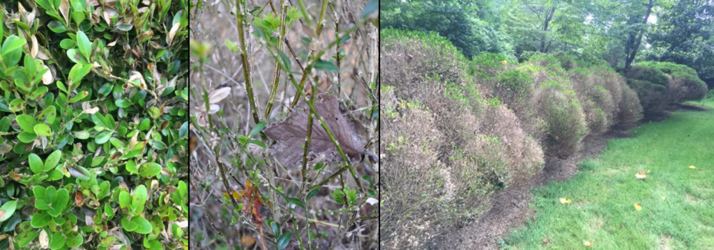 Boxwoods with boxwood blight. See brown leaf spots (left), black streaking on stems (middle), and defoliation (right).