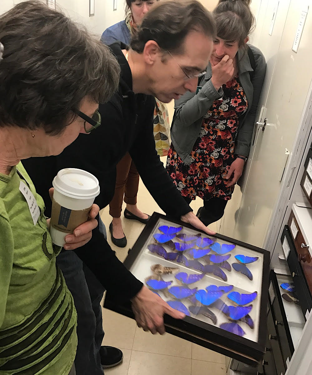 Stuart McKamey pulls a tray of pinned blue morpho butterflies out of the its cabinet and we are simultaneously drawn in and blown away by their iridescence!