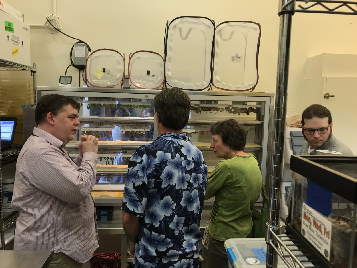 We made sure to stop by the Insect Zoo, where I was elated to see that they still show off the giant hissing cockroach, as well as many other wonderful creepy crawlies. We couldn’t stay too long though, as we had a meeting with Research Entomologist, Stuart H. McKamey, of the Systematic Entomology Laboratory. One of my fellow curators, Elliott Phillips, was a formerly a research contractor here and worked with McKamey. Those two were eager to catch up, but invited the rest of us to tag along. To our delight, they surprised us with a behind-the-scenes tour of the Smithsonian Institution’s insect collection! It is hard to convey just how incredible this enormous collection is, but I will try. There are four floors of nothing but row-after-row of insect cabinets. The newest ones are high-tech and engineered for space efficiency,