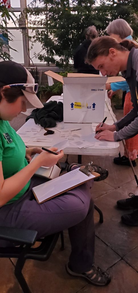 Senior Butterfly Curator Mary Lincoln (that’s me!) and Seasonal Butterfly Curator Tyler Crossen working to identify and record captured butterflies.