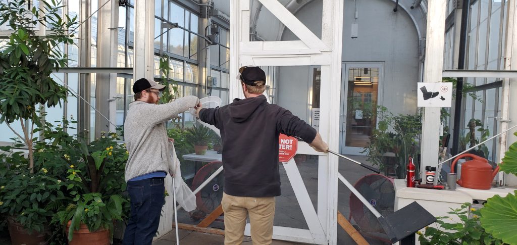 Senior Butterfly Curator Daniel Wright and Conservatory Horticulturalist Ryan Olsen capturing a particularly jumpy butterfly.