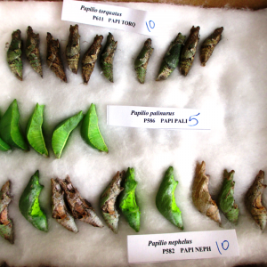Pictured top to bottom: Torquatus swallowtail (Papilio torquatus), banded peacock (Papilio palinurus), and black and white helen (Papilio nephelus) chrysalids.
