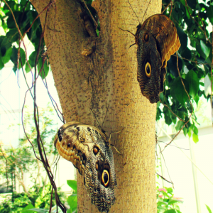 Giant owl (Caligo memnon) and forest blue mort (Caligo eurilochus) butterflies blending in with a weeping fig tree (Ficus benjamina ‘Indigo’).