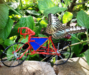Blue clipper (Parthenos sylvia lilacinus) on red and blue bike