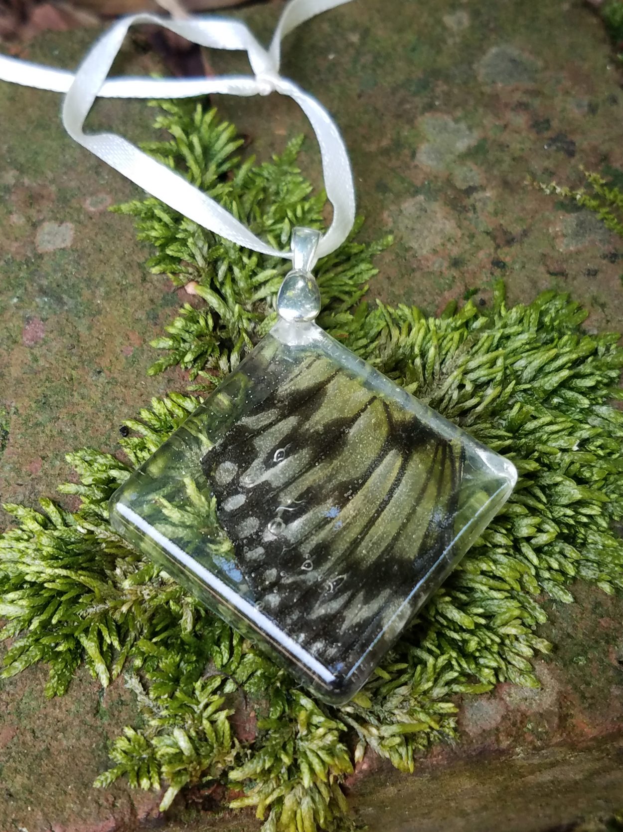Square, Paper Kite Butterfly wing pendant in a bed of moss.