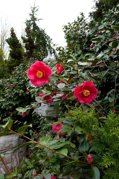 Caption – The camellia originated in Asia, represented by this ornamental stone lantern in the Asian Valley at Lewis Ginter Botanical Garden. Photo by Don Williamson