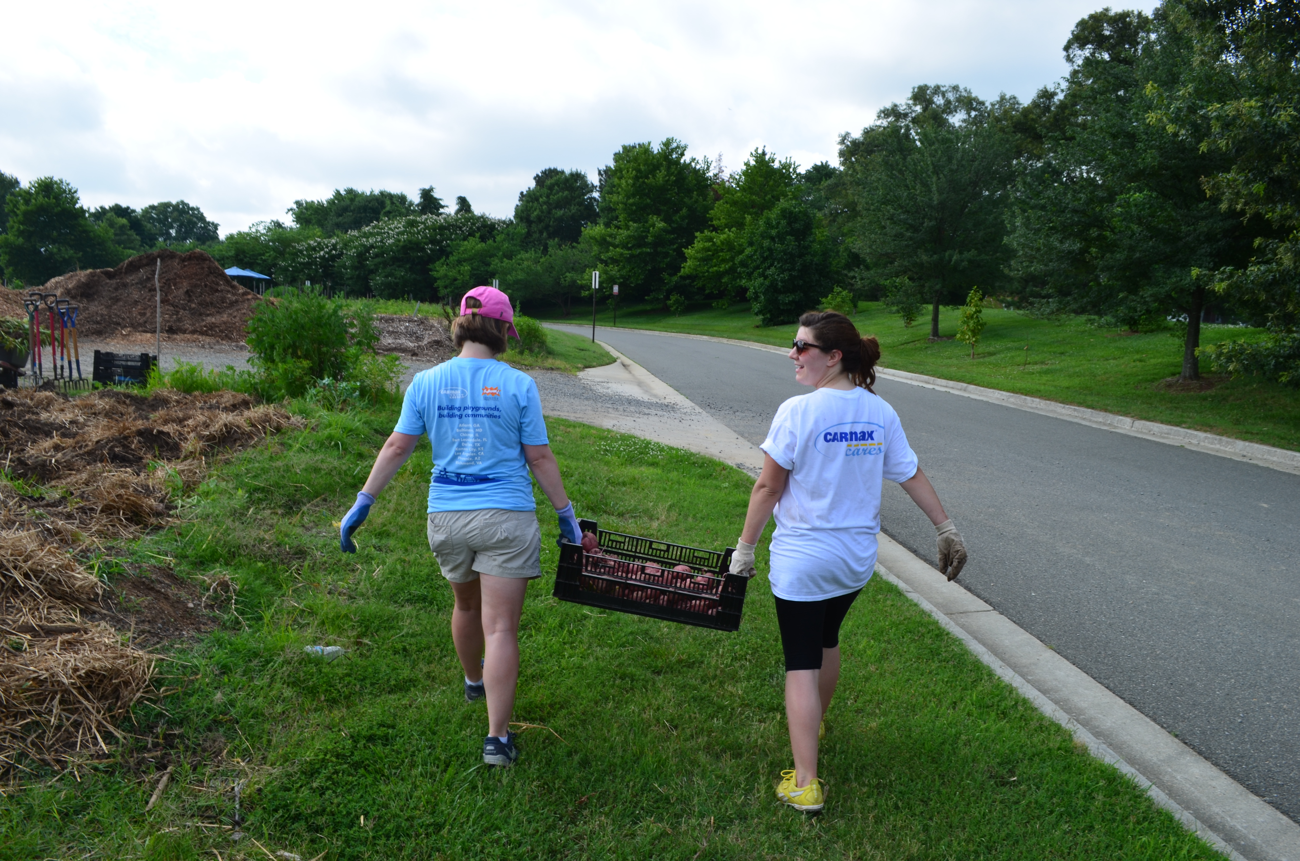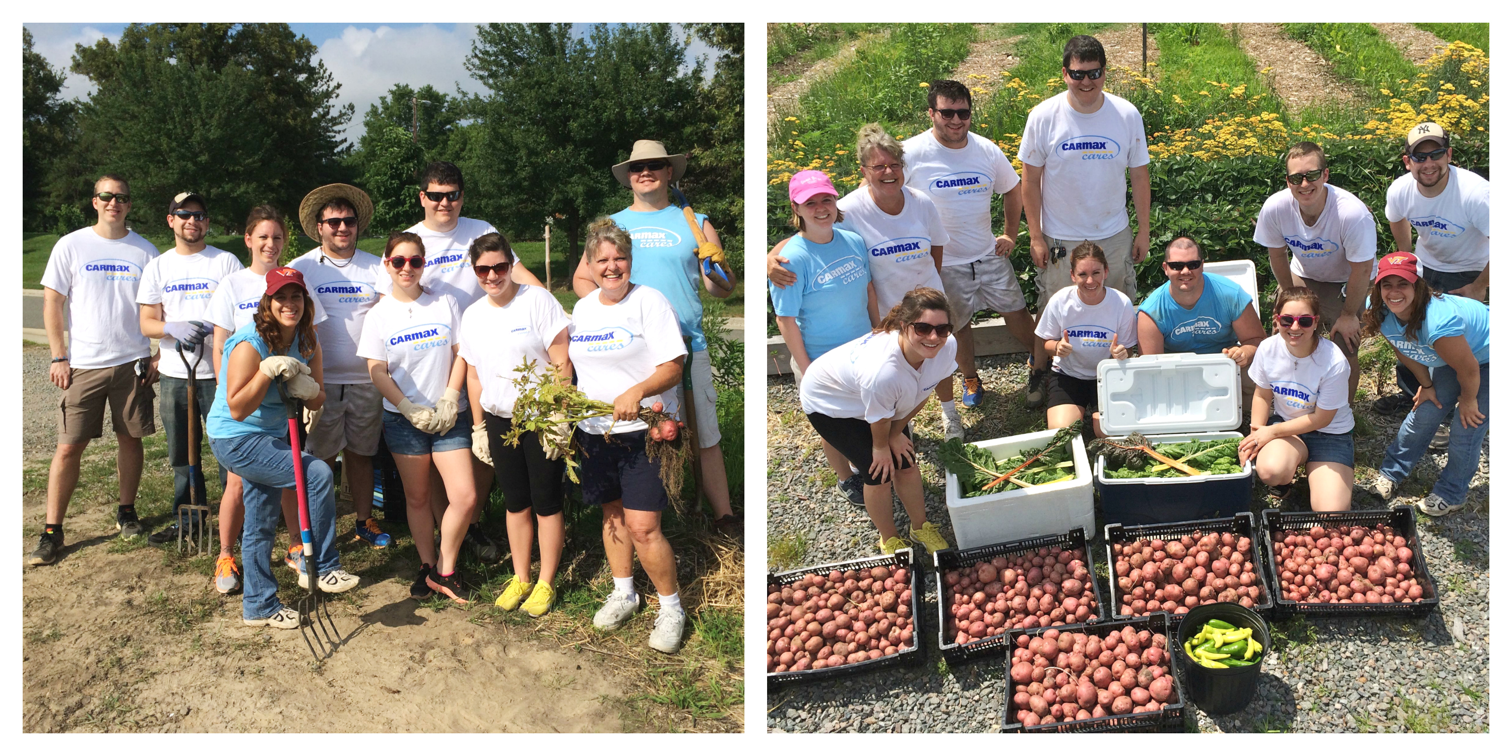 …And then they started work in the Community Kitchen Garden. On their first visit in June, the CarMax team mulched pathways, planted eggplant, built a support structure for fava beans, and accomplished a huge amount of weeding. A few weeks later, a new team arrived to harvest 160 lbs. of red potatoes, harvested sweet peppers and Swiss chard, they tossed a mountain of weeds into the compost pile, completed a trellis for cucumbers, weeded a bed of fava beans, and mulched beds of eggplant. If you’ve ever wondered how many people 160 lbs. of new potatoes can feed, that is enough potatoes for Feedmore’s Community Kitchen to provide 400 servings of mashed potatoes or 800 servings of potato salad to Meals on Wheels recipients!