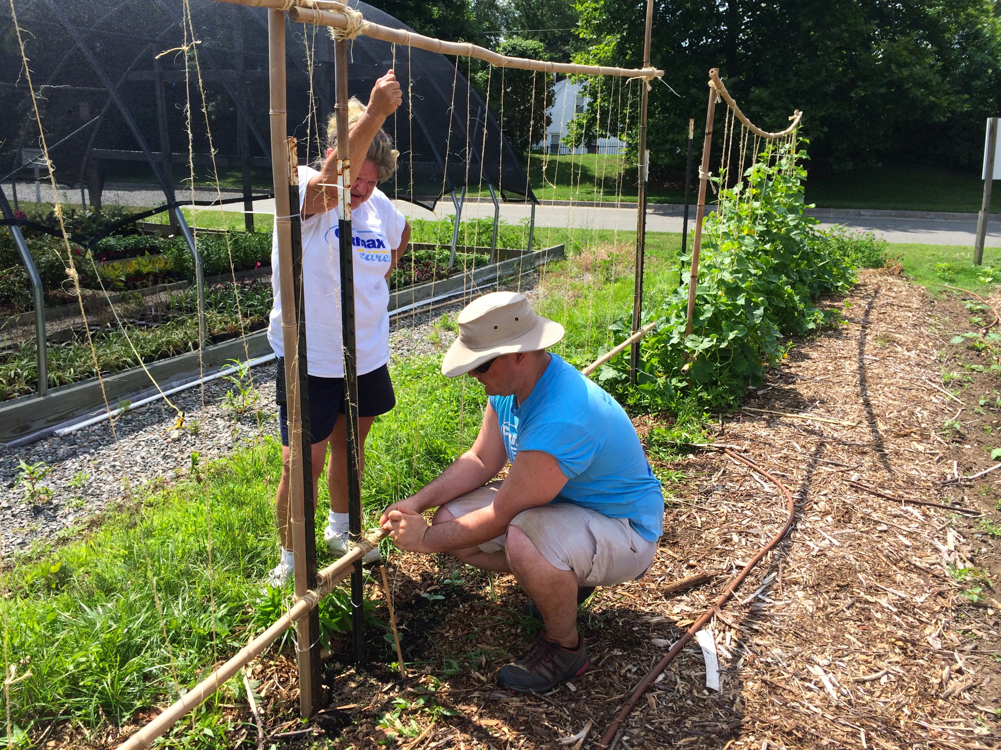 CarMax associates made quick work on a cucumber trellis. The trellis will allow the cucumbers to have more room to grow in a small space.