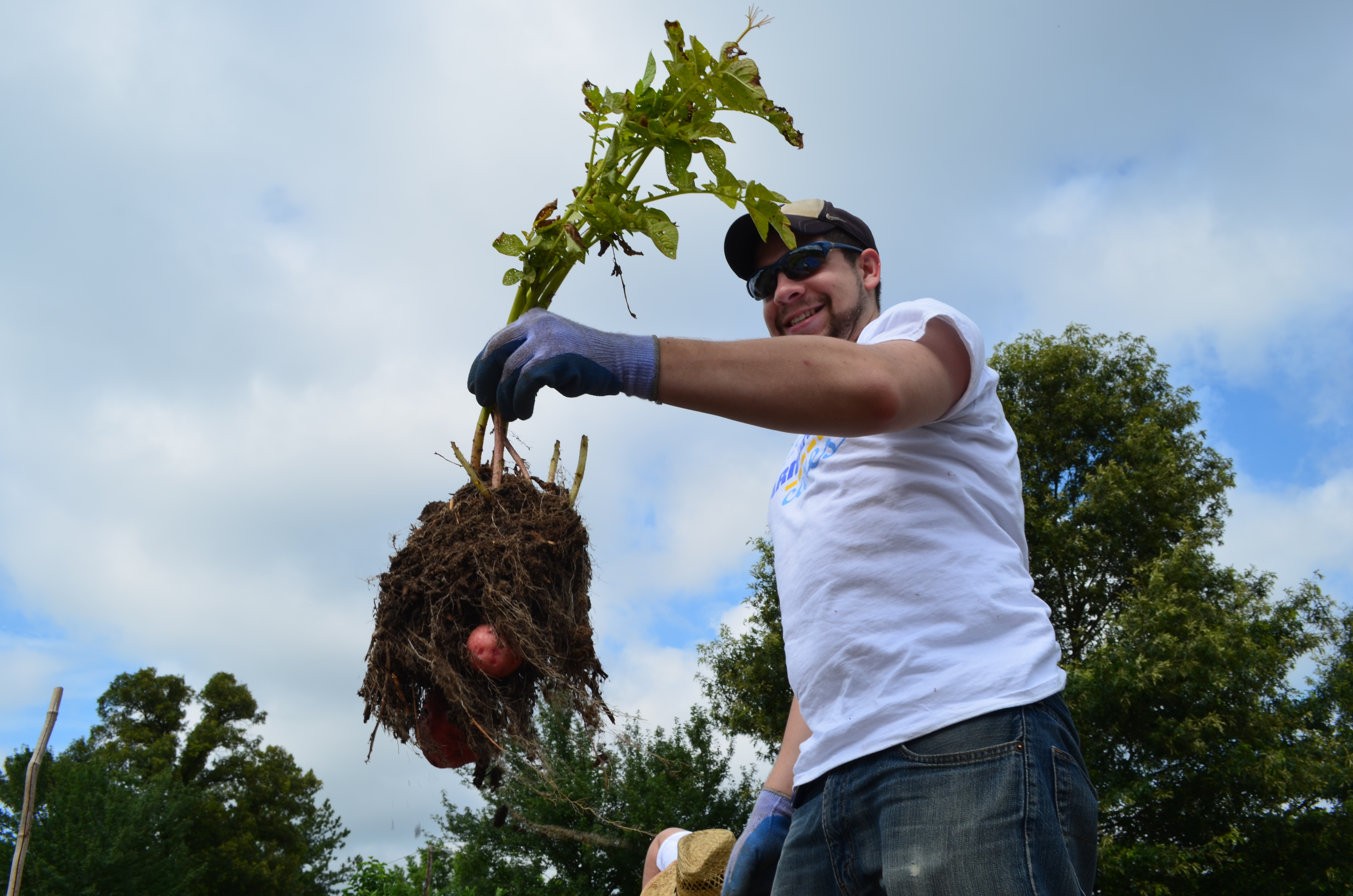 Pulling the new red potatoes out of the ground to dry in the sun, before delivery to Feedmore’s Community Kitchen. On this day, the team delivered 192 lbs. of fresh vegetables to FeedMore (red potatoes: 162 lbs, Swiss chard: 22 lbs, red okra: 1 lb, sweet peppers: 7lbs).