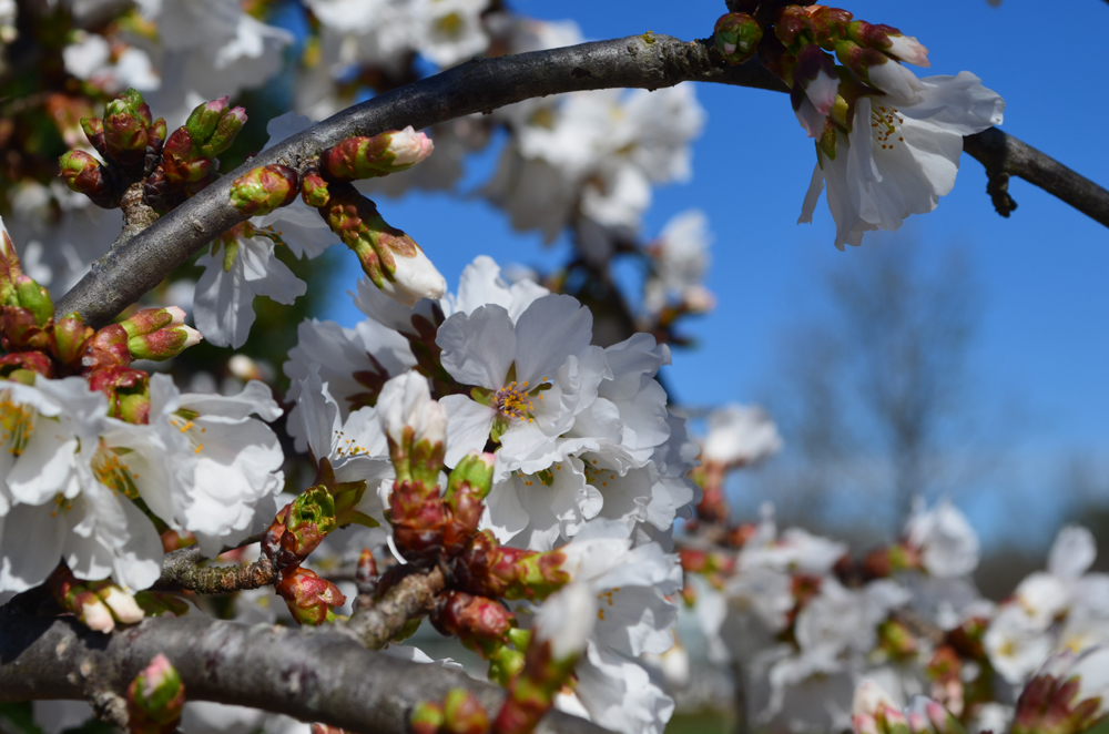One of the wonderful things about Lewis Ginter Botanical Garden’s Cherry Tree Walk is that we designed it for an extended bloom time. That means that while our Japanese flowering apricot trees (Prunus mume) may have bloomed, and our Prunus sargentii ‘Columnaris’ and Prunus incam ‘Okamé’ trees are blooming now, the biggest flush of blooms is yet to come, and may start as early as this weekend.