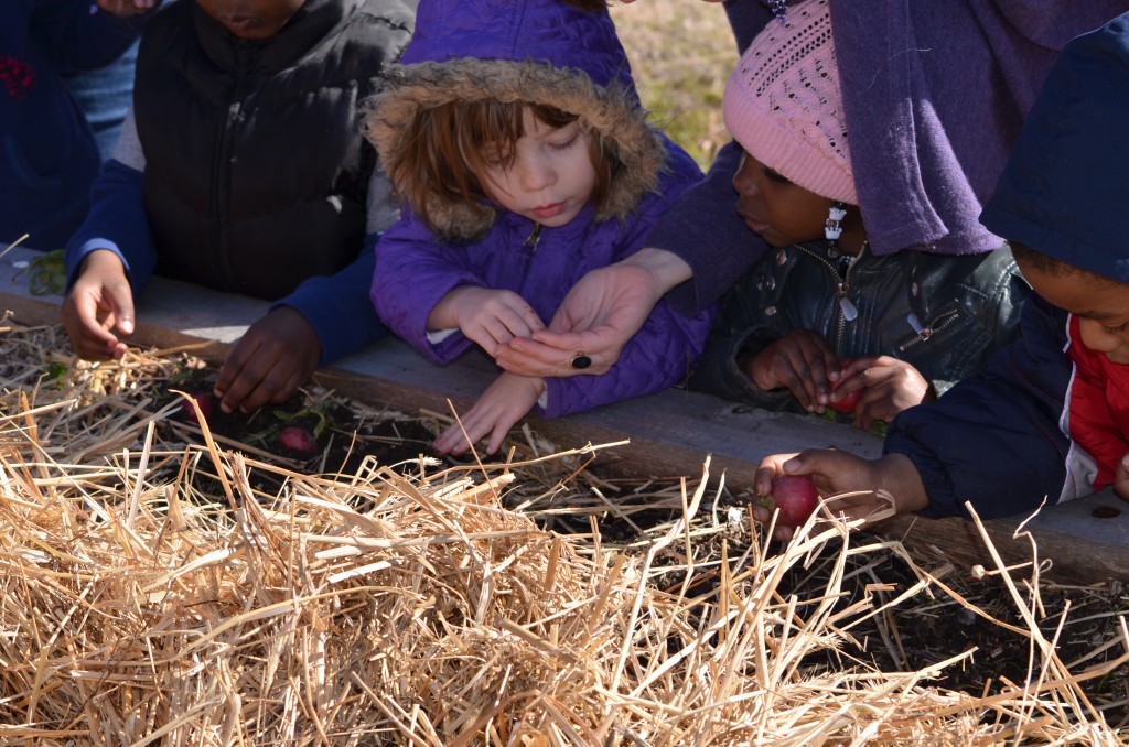 *Little hands holding big radishes (just in case they weren’t familiar with them we had a few that were picked from the Children’s Garden this morning) and planting teeny tiny radish seeds very carefully.