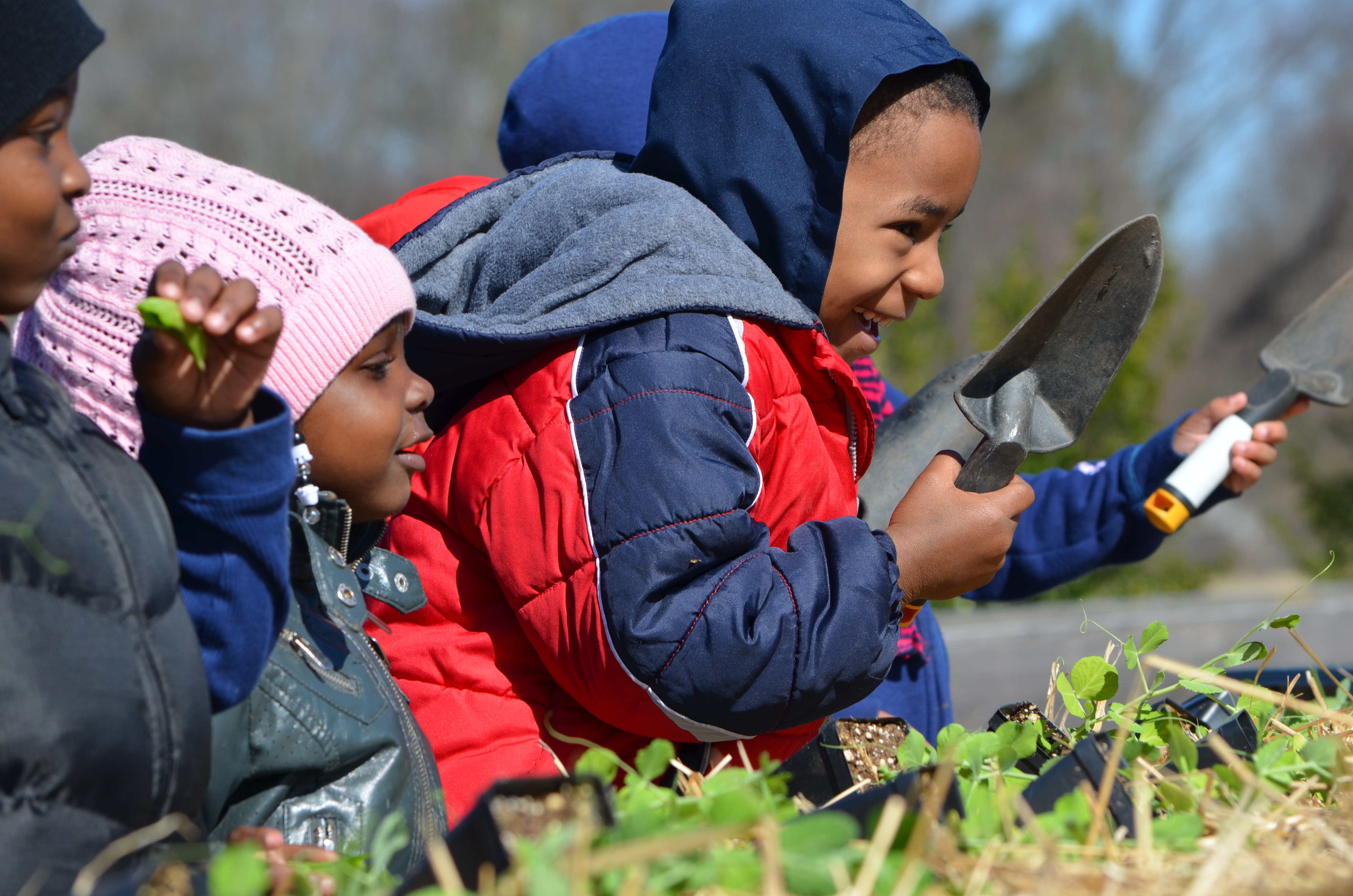 Children from FeedMore’s Kids Cafe location at Capital Childcare planting (and EATING) peas. Photo by Jonah Holland