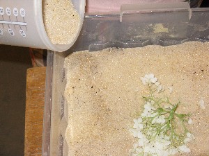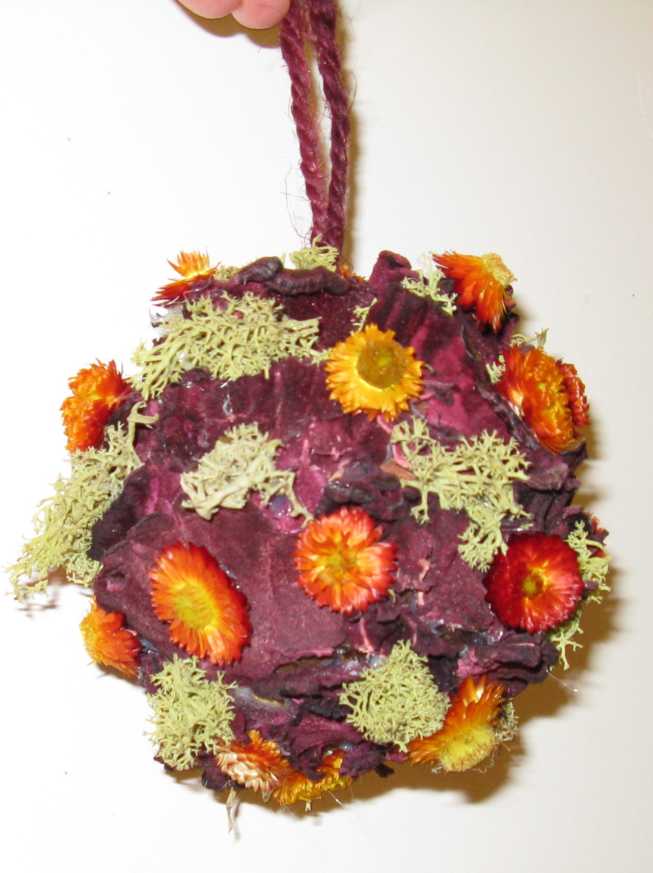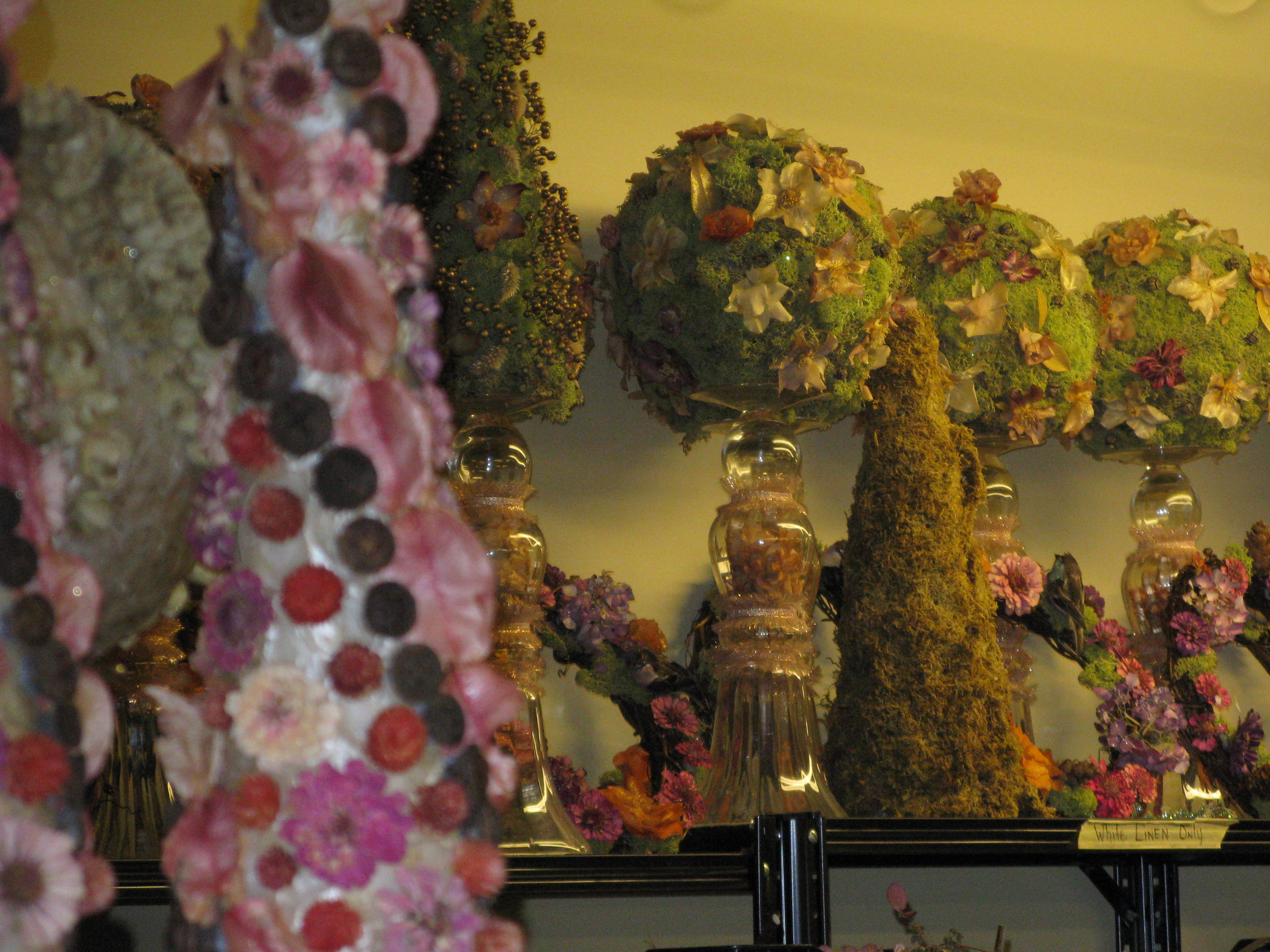 There’s years of experience on tap for this project, from best plants for drying — and the best technique for each one. Apparently, we had a disaster this year when an experimental method for keeping lotus leaves flat while drying resulted in a mildewed mess—oh well, sometimes you have to go with the flow, and start fresh. We’ll be working with the second crop of lotus leaves, and around their ‘personalities’. Plants are harvested all summer and carried to the basement workshop in the Education & Library Complex where GardenFest magic is crafted. Some plants are dried in silica gel, which works great, preserves the shape of the plant part and a good bit of the color, and can be reused a number of times. Even peonies get the spa treatment! In addition to the gel, some plants are air dried, some are pressed. In October, more fun starts as the staff puts their design ideas into action. The result: remarkable, unique ornaments and decorations.