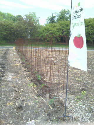 Then we placed old newspapers down around the plants, about 5-6 sheets thick. Tom must have been so impressed with our muscles moving the bags of manure that he then made us shovel mulch all over the newspapers to a depth of several inches. Who knew that there was such an art to putting down mulch?! As the location of the veggie garden is quite open and can get pretty windy, the mulch had to completely cover the edges of the newspapers so that the wind would not be able to get underneath and blow them away. Then we had to go back and make sure that there was no mulch touching the plants, especially the stems of the tomato plants, as this can damage them.