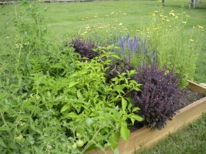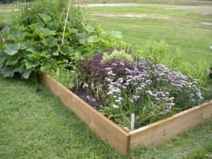 This week we spent some time tending the home demo garden. This is a small raised bed, approximately 4’ by 12’ that shows just how much home gardeners could grow in their own back yard, in a small area. It’s jam-packed with veggies such as Roma tomatoes, bell peppers, squash, and hot chili peppers. There’s also lots of herbs including basil, thyme, and purple basil. What makes this small garden special though is that there are other flowers planted among the herbs and veggies; marigolds next to the tomatoes, and salvia next to the herbs. The addition of flowers takes the vegetable garden from being solely functional to something pleasant to look at. I think a lot of people who might wish to have a veggie garden in their own yard worry that it could end up looking ugly, but as you can see from the picture below, a couple of extra plants can really transform a garden.