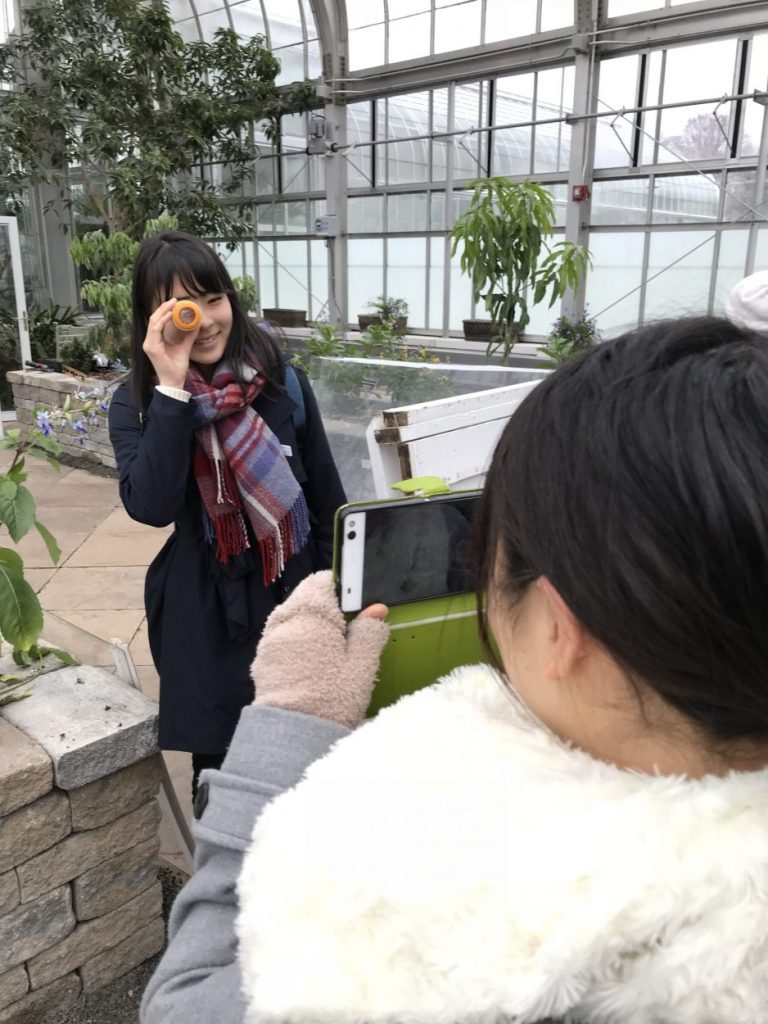 The Japanese exchange students then got a behind-the-scenes preview of M&T Bank Butterflies LIVE! exhibit. In this photo, one teen is looking through an eye-piece that helps her “see like a butterfly,” while the other takes her photo.