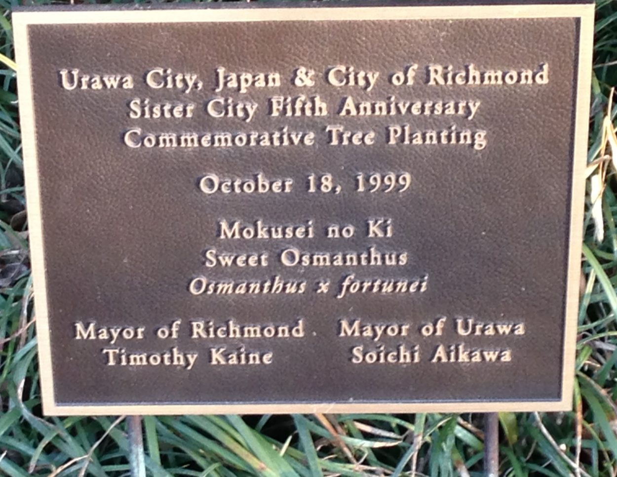 The group of about 20 students, 10 Japanese exchange students from Municipal Urawa High School (Saitama, Japan), and their 10 host students viewed a special plaque honoring the relationship between the sister cities of Richmond and Urawa (Saitama). The plaque commemorates a tree planting on October 18, 1999, when delegations from Richmond City and the Japanese city of Urawa planted a sweet osmanthus (Osmanthus x fortunei) tree. Each autumn the fragrant blooms fill the Asian Valley as the tiny white blooms open in the sun.