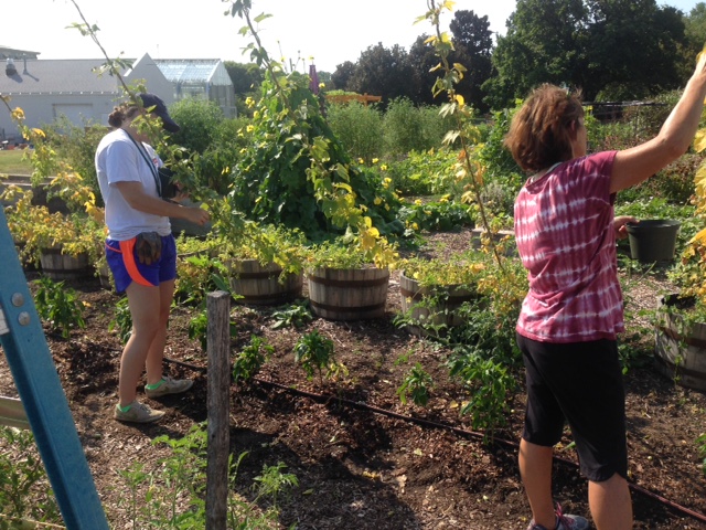And although our plants didn’t grow to be 25 feet this season, we were still able to make our first hop harvest this past Tuesday. With the help of Lewis Ginter Botanical Garden volunteers Terry Lautzenheiser and Hannah Beck, we harvested 2 ½ quart size bags of ‘Cascade’ hops. We knew some of the hop cones were ready for harvest based on the papery feel, slight browning at the tips, golden yellow lupulin glands (which contain the acids and oils important for brewing beer), and the strong hop aroma. These hops will not be donated to Feedmore like the rest of the produce grown in the Community Kitchen Garden, but instead used as a tool to teach visitors about a plant with ornamental value that could become in important cash crop for our state in the future.