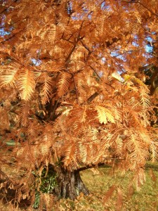 One of our wonderful volunteers, Linda Miller, was talking about the dawn redwoods planted on Monument Avenue in the median strip near her home. She had enjoyed watching the young trees grow and develop their graceful feathery foliage. But towards late October the leaves began to turn a rusty brown and then began to fall off the tree. Maybe you noticed this phenomenon too? Linda was distraught to think that the beautiful new “evergreens” were about to die. But, after asking a few questions here at the Garden, she learned that the dawn redwoods were just behaving normally. Though they look like many other needled evergreens (such as pines and firs) each fall, the leaves actually turn a copper color and the branches lose all their leaves.