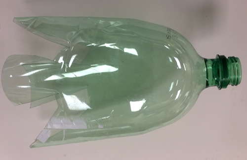 This green soda bottle gives a good example of what your fish will look like after you flatten the back and cut two notches for the fins and tail of the fish. Next step: stapling the tail.