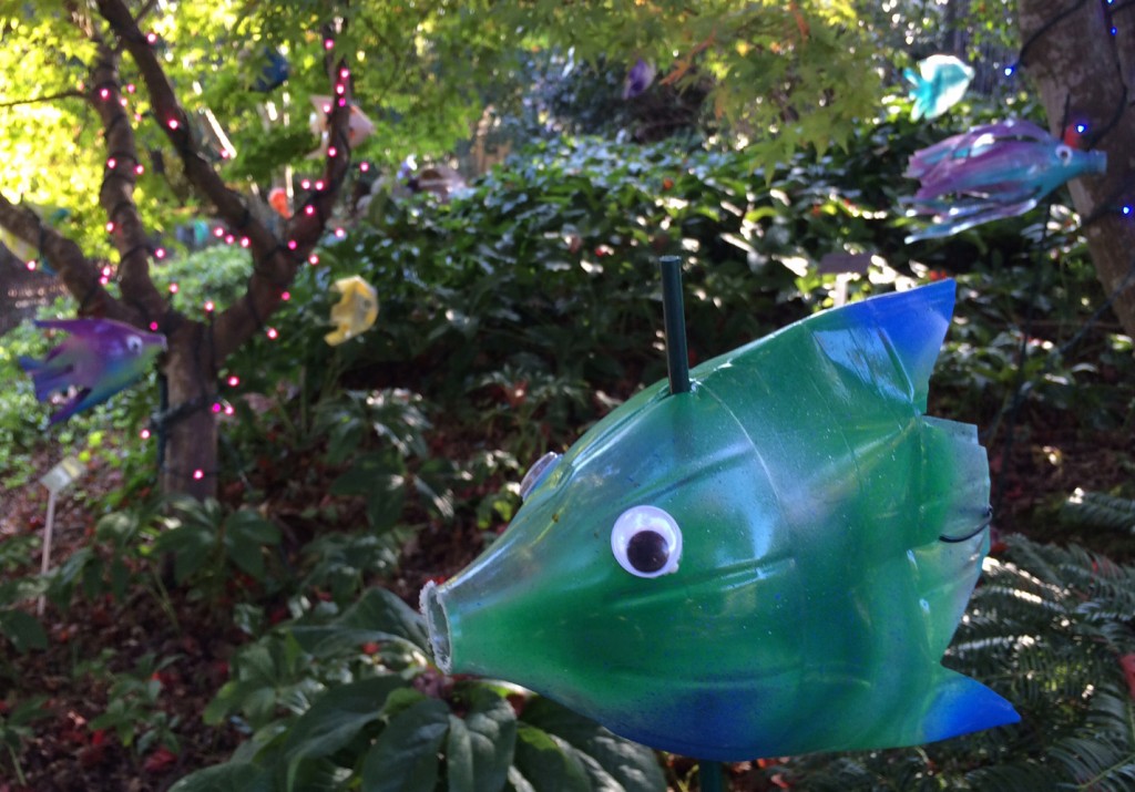 With this year’s water theme, we decided fish, octopuses, and jellyfish would be the perfect ambassadors for our message about what you can do at home to help keep our waterways healthy. We are thrilled that our (do it yourself) DIY bottle fish decorations that we just put up this week are already a hit. I’ve watched school groups visiting the Garden on field trips squeal in delight when they see the bottle fish swimming from our trees. We have 150 bottlefish swimming outside in the Asian Valley. In the Conservatory we have another 125, including four schools of different types of fish. Here is the step-by-step process of how you can make these DIY soda bottle fish decorations at home. We hope you have fun making them! We sure did.