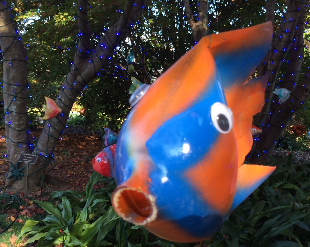 After we choose the theme (in case you haven’t heard, this year’s theme is H2Whoa!) we think of how we can make decorations for GardenFest using material that is sustainable or recyclable. This means that often we grow supplies that we’ll need to make our decorations. For example we grew gourds for the top of the tillandsia jellyfish in the Conservatory. When we can’t grow what we need, then the next best thing is to create something fun out of materials that have been recycled or donated. A few years ago, we provided step-by-step directions of how to make recycled soda bottle flowers using basic supplies and items you might already have on hand. Those were pretty magical, because not only were they beautiful, easy to make and inexpensive, they also could be attached to strands of lights. And since we are setting an environmental example for the community, not only are we recycling, but we are reusing decorations. You’ll find those soda bottle flower lights being reused this year in the Central Garden.