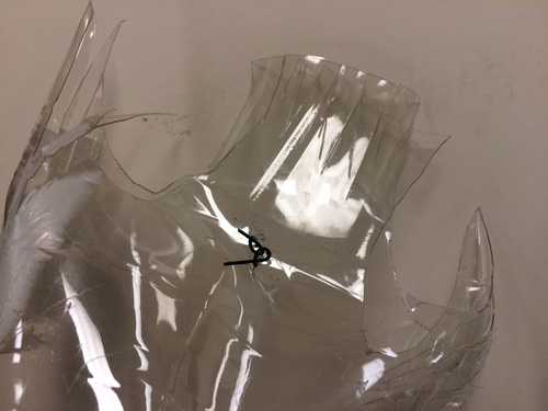 - Make the appropriate cuts with scissors to shape the body, tail and fins. Cut 2 notches out of the open side of the bottle, these create the back and side-fins. (Don’t forget your safety goggles!) Make your initial cut by going through both layers of the bottle (flatten the bottle in that specific area) then finish by cutting the layers singly.