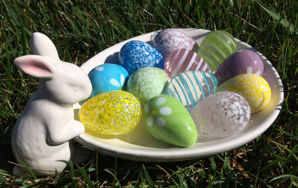 Look what the Easter bunny brought! A clutch of hand crafted art glass eggs in pastel hues, just the thing to tuck into a basket or scatter around the table at Easter brunch. (12 eggs in each collection.) Small $22.95, large $33.95